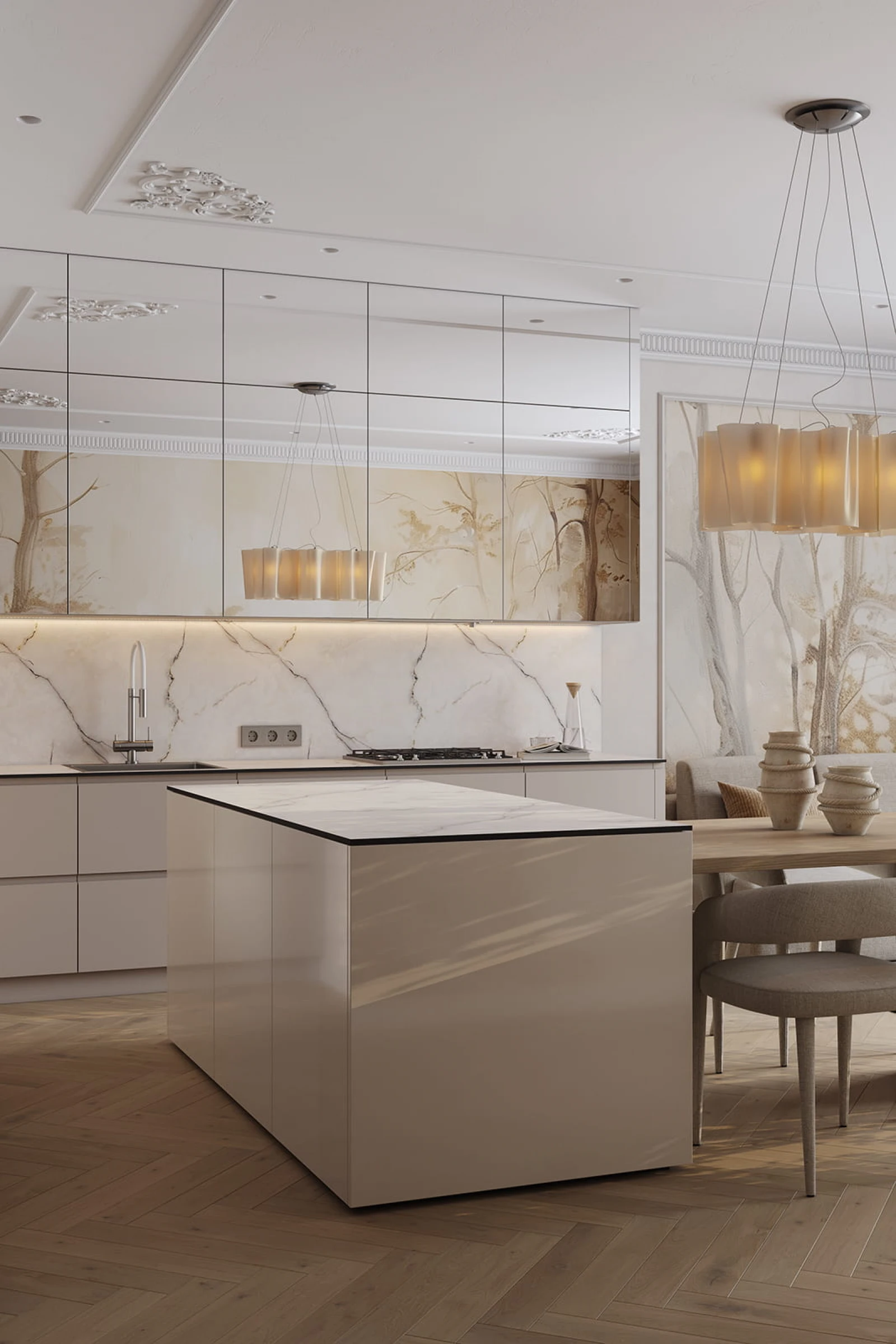 Крашеная МДФ, цвет NCS S 2002-Y50R Матовый / акрил Глянец, цвет Тальк / зеркало,