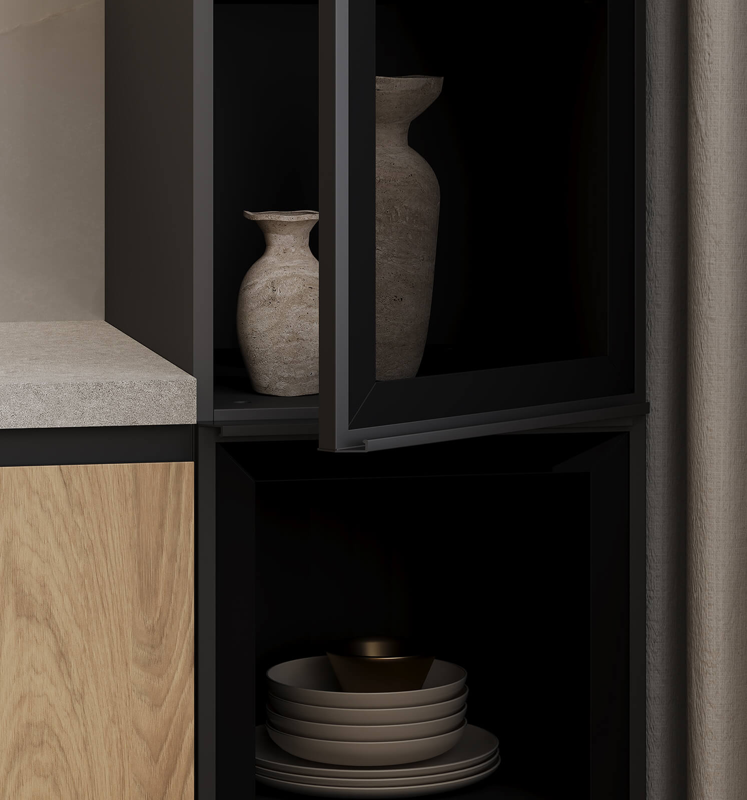 ЛДСП Вуд, декор Гикори Натуральный / Эрден (МДФ/ПВХ), цвет Белый Матовый / алюминиевый профиль А-2 Терра Черная (стекло Графит прозрачное),