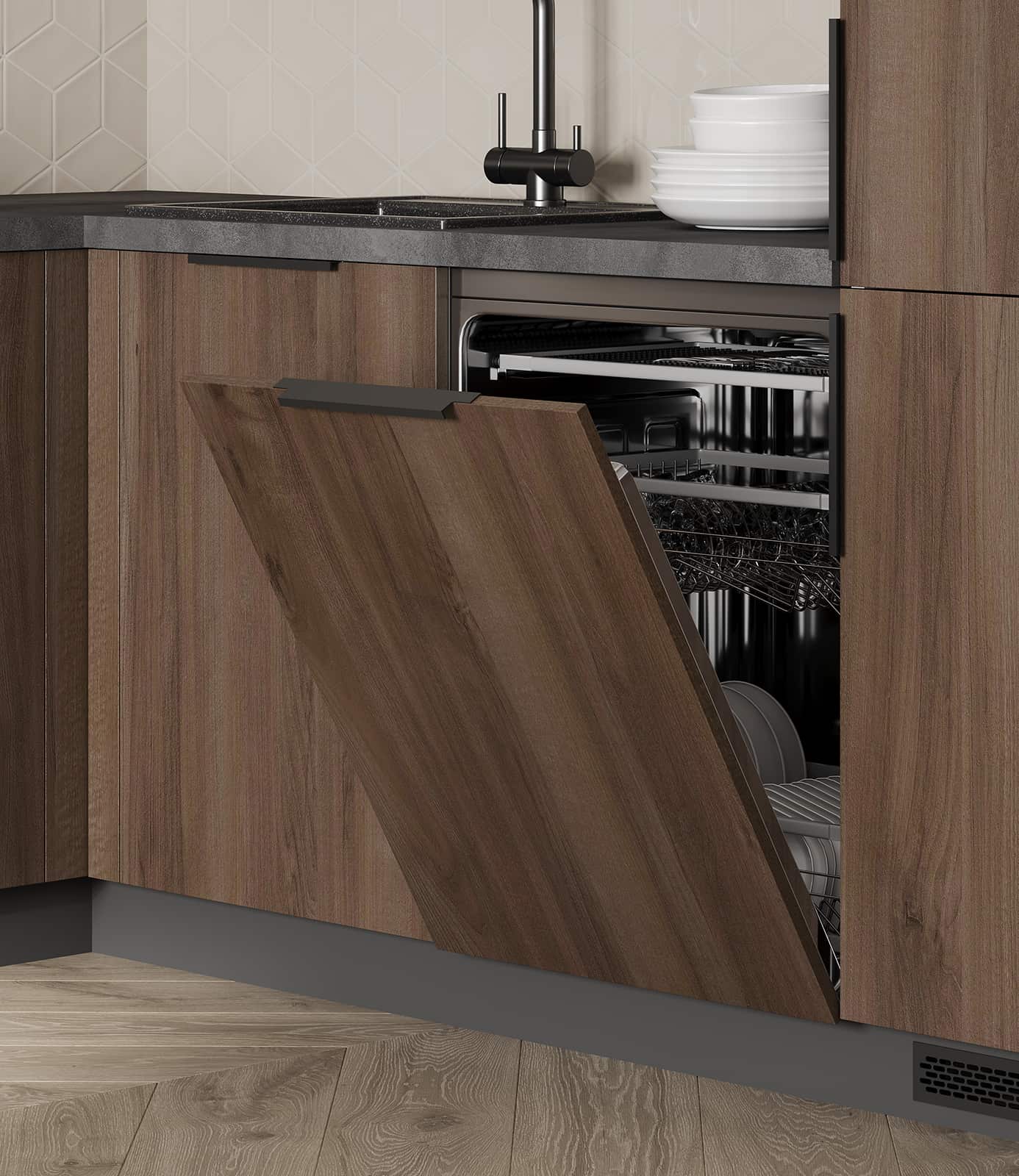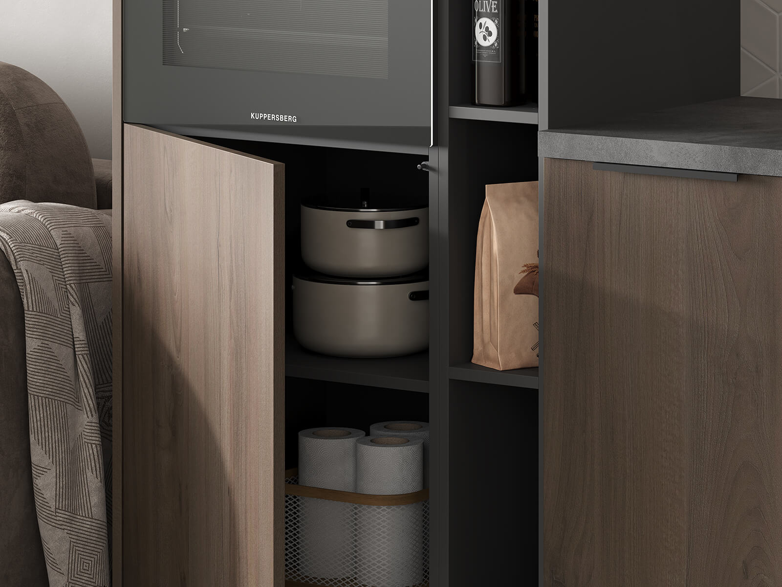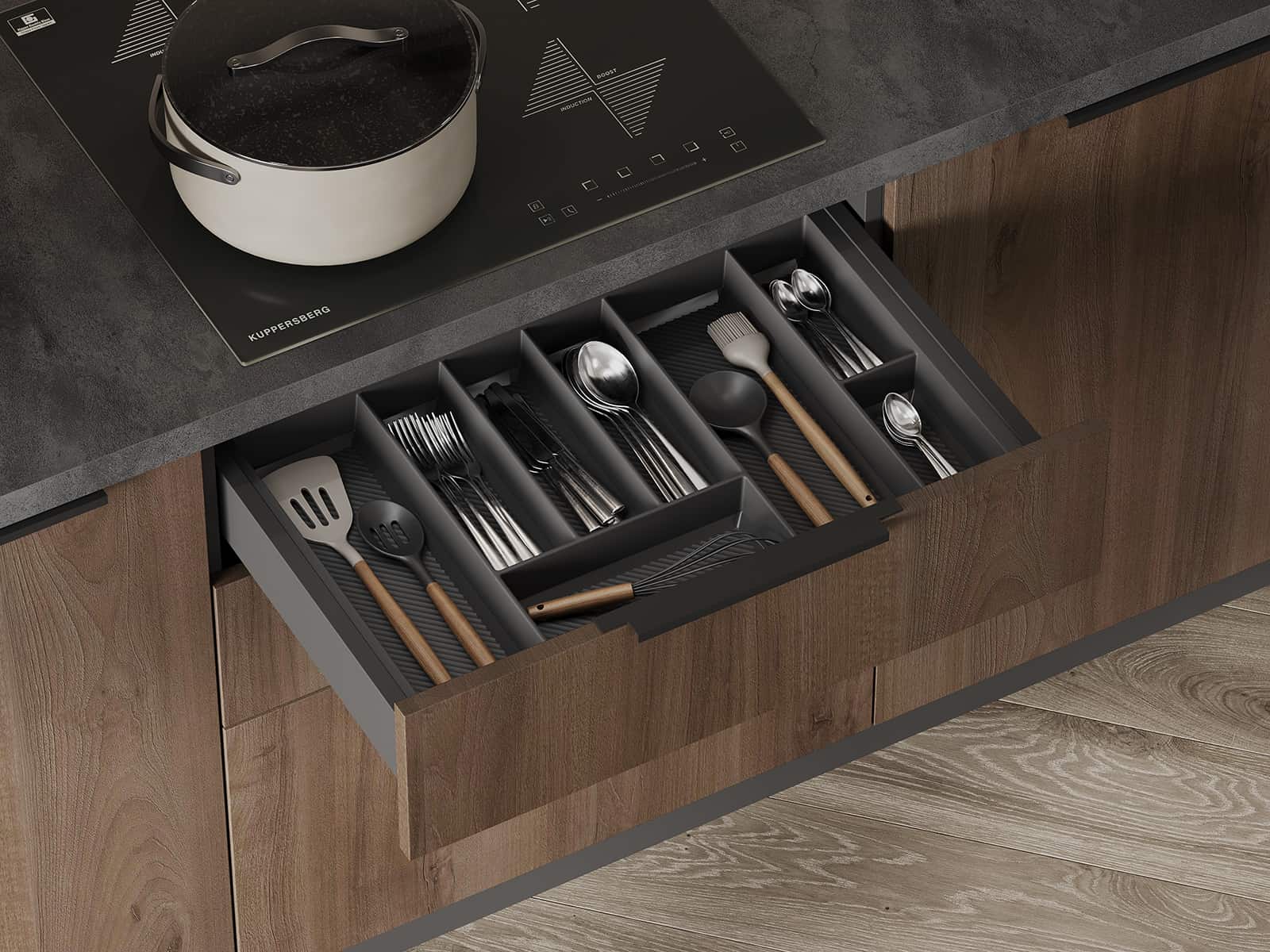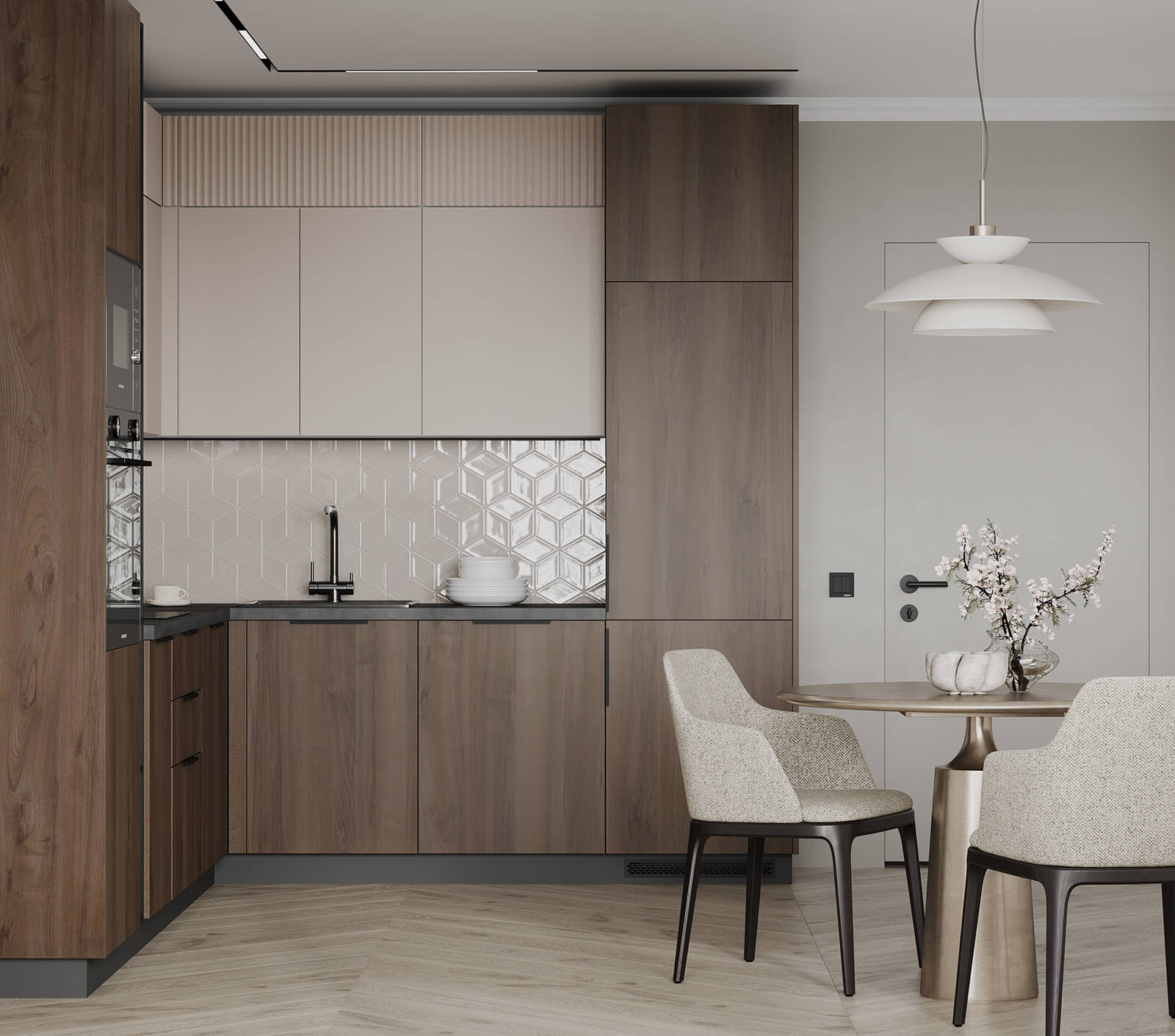 Фасады Авис (МДФ/ПВХ), цвет Сатин Песочный Ф Premier Matt / МДФ/ПВХ, цвет Сатин Песочный Ф Premier Matt / ЛДСП 18 мм, декор Орех Пацифик, Столешница Пластик HPL, декор Детройт (толщина 38 мм, кромка ABS), Корпус ЛДСП, цвет Графит / Белый Премиум (толщина 18 мм)