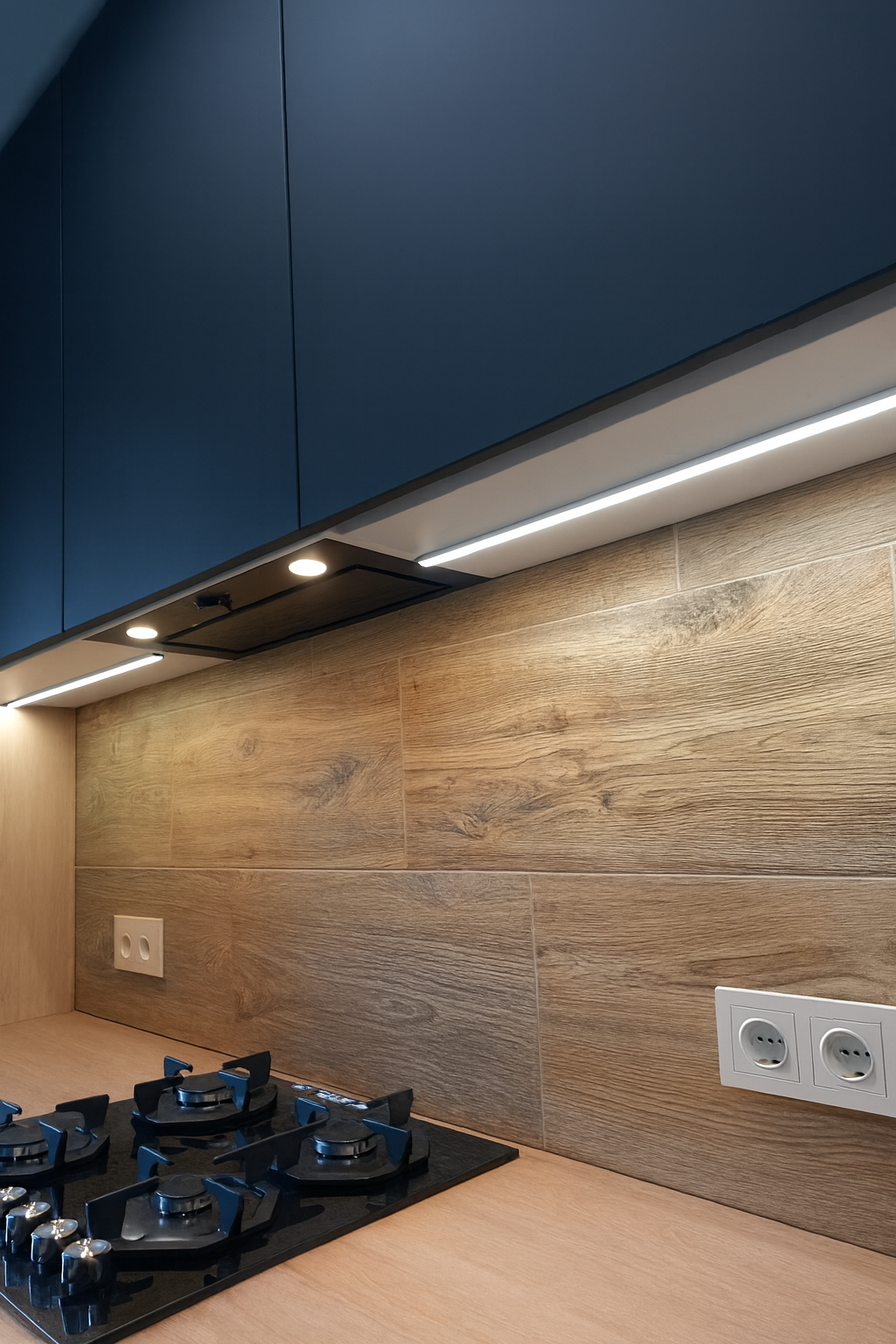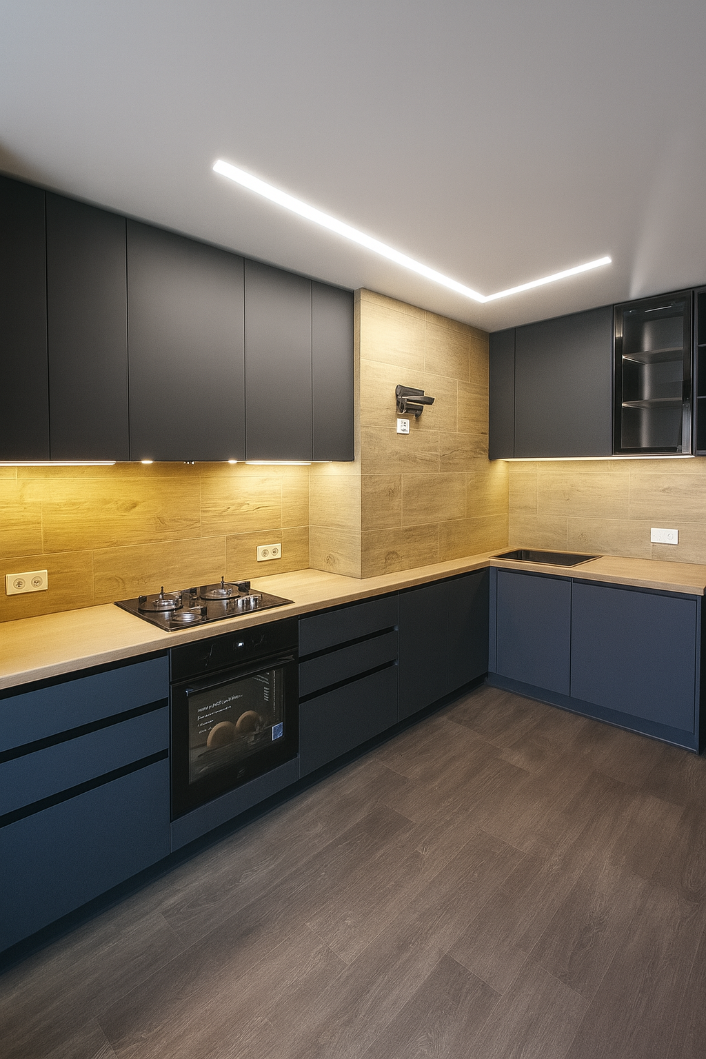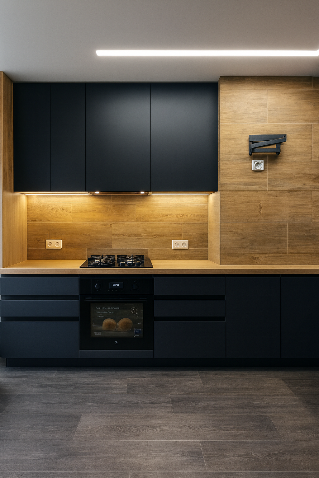 Минималистичная кухня в светлых тонах с древесной текстурой