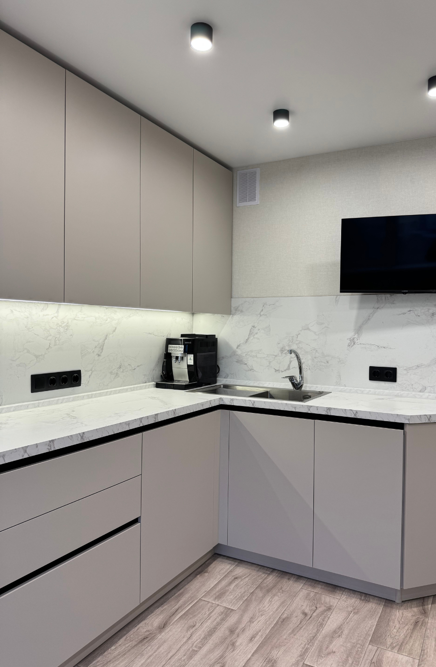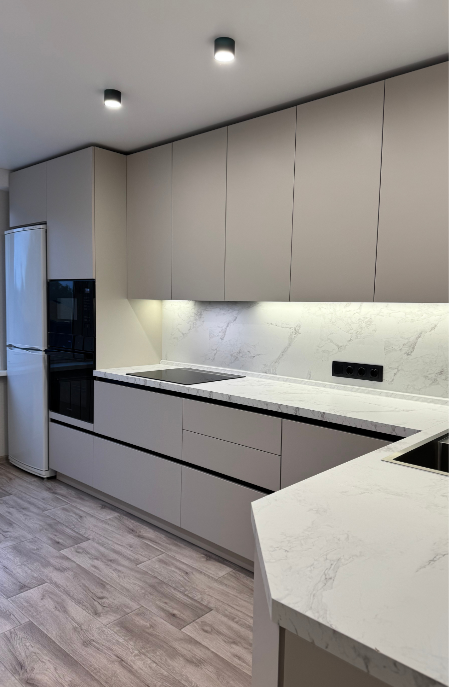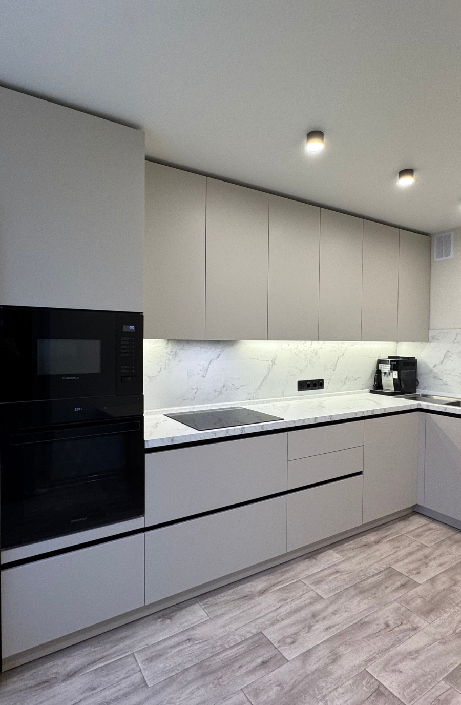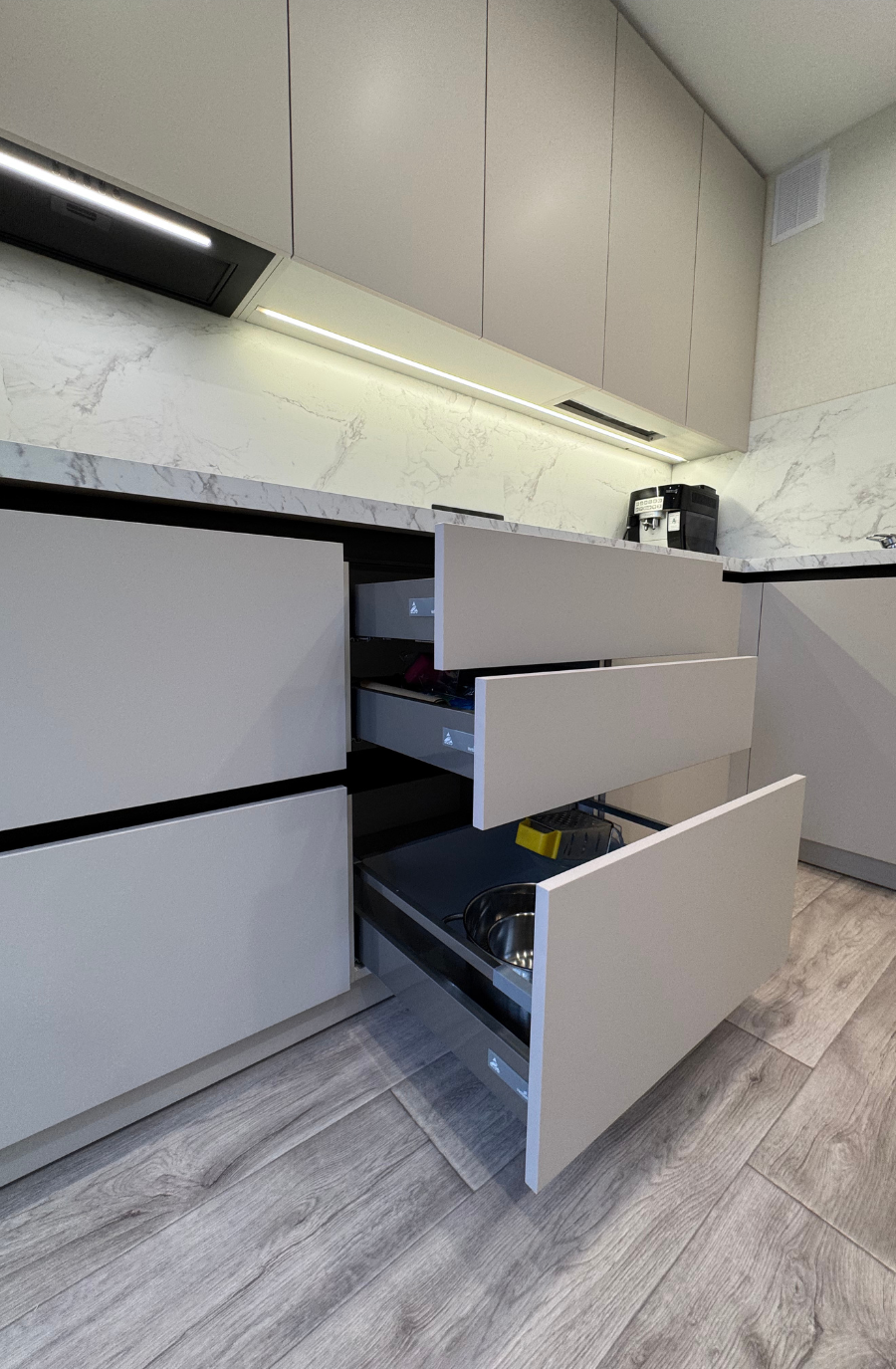 Петли Blum clip top blumotion, все выдвижные - Hettich InnoTech, Столешница HPL и стеновая панель - Мрамор Бернини , Гола профиль.