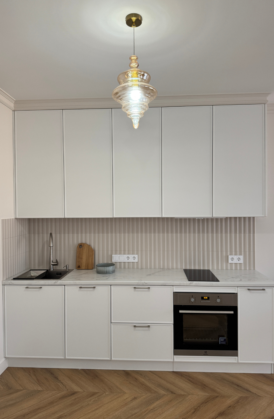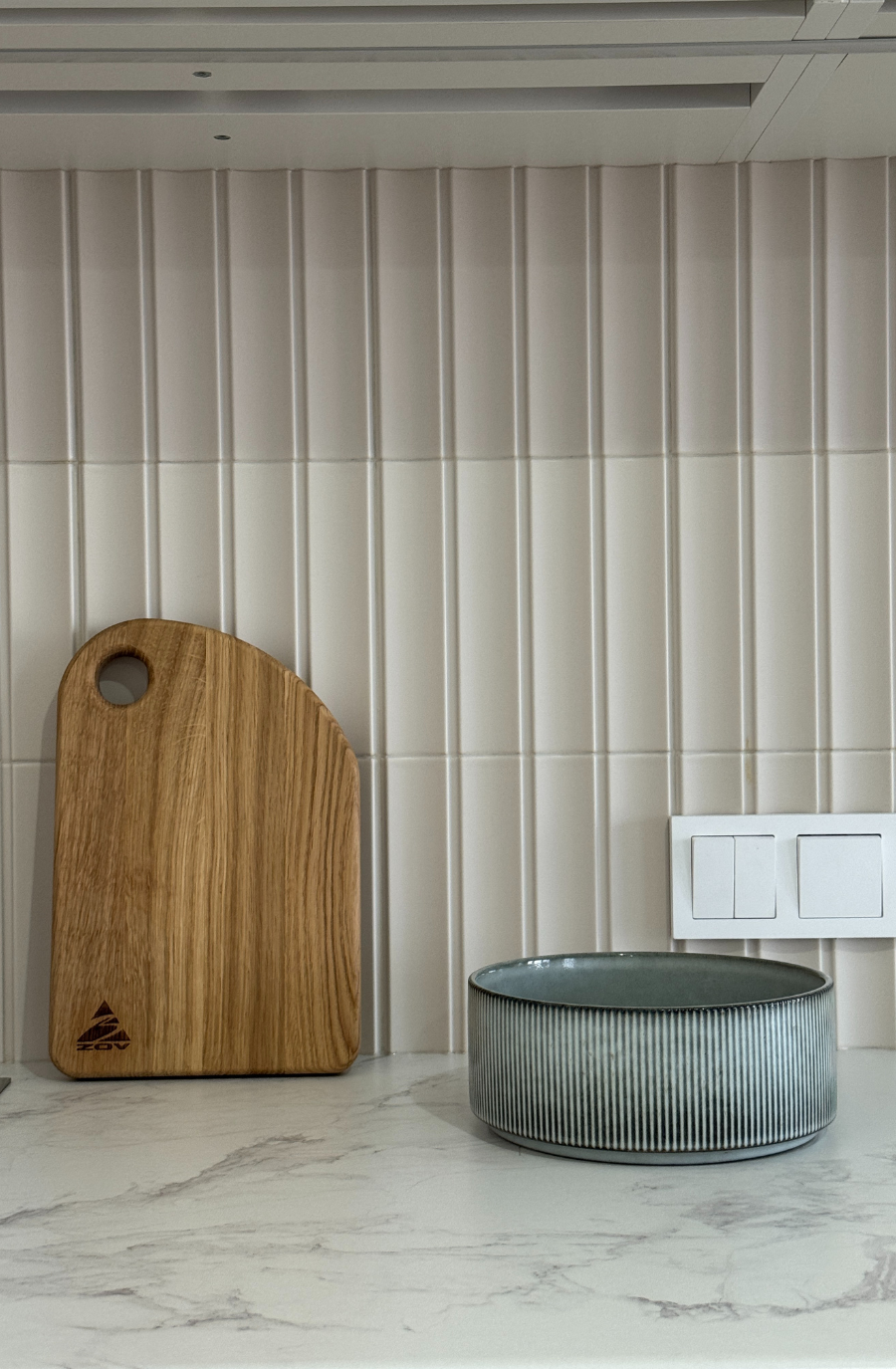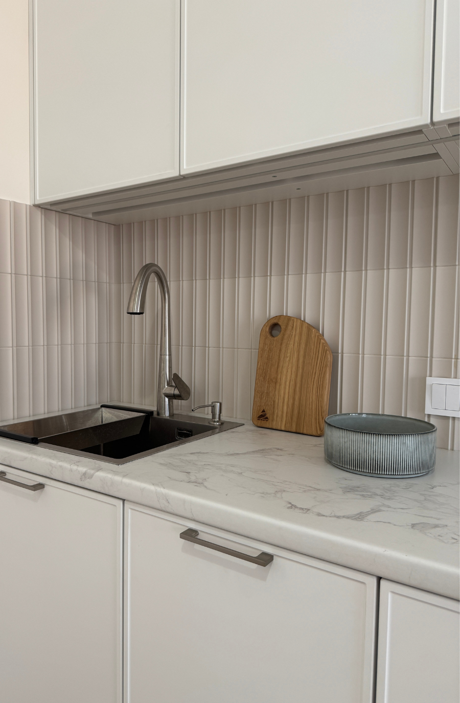 Минималистичная кухня в светлых тонах с древесной текстурой