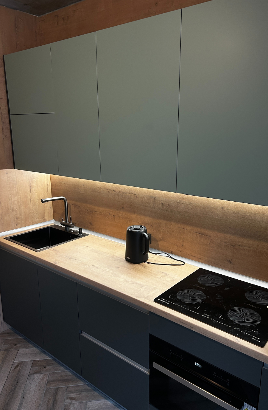 Прямая кухня в современном стиле с подсветкой