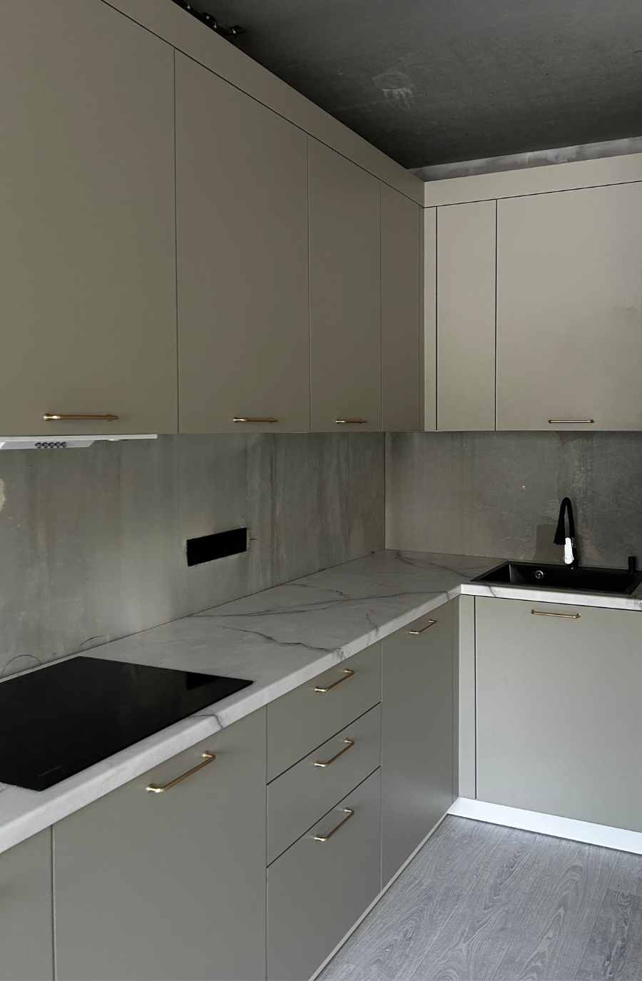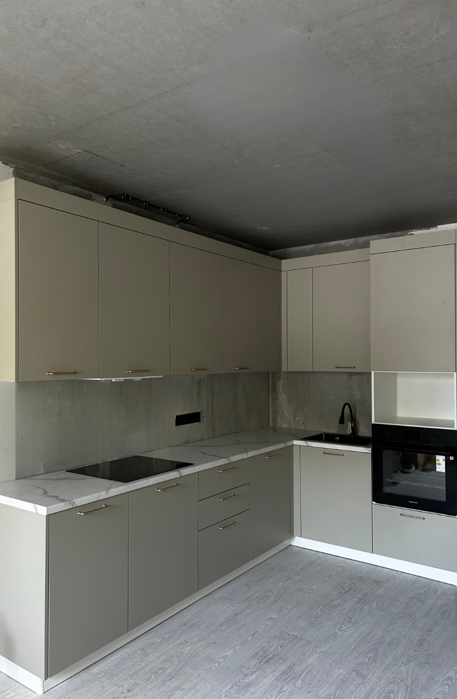 Угловая кухня на заказ в светло-сером цвете